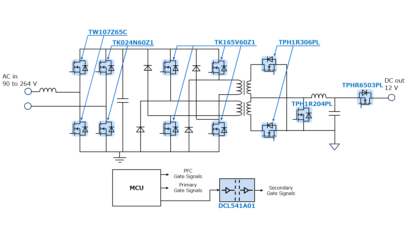 | Power MOSFET (N-ch 500V<VDSS≤700V) | PFC Circuit・3 | N-ch MOSFET, 600 V, 0.024 Ω@10V, TO-247, DTMOSⅥ | |