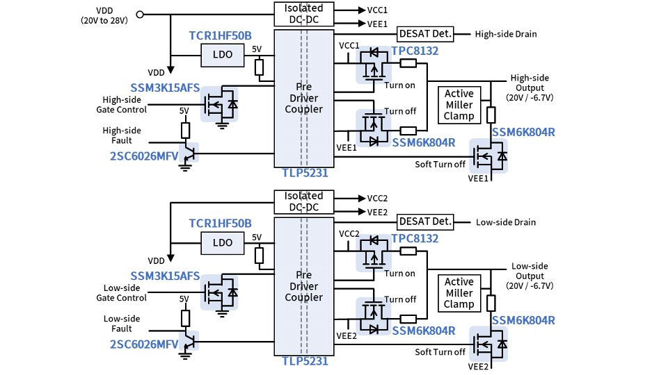 This design uses the TLP5231 pre-driver coupler, which is capable of high-current gate drive with external buffer MOSFETs and has various built-in protection functions to implement the isolated-gate drive of a high-current/high-voltage SiC MOSFET module. It consists of two channels, high-side and low-side, on a 62mm x 100mm board and can be installed on Toshiba dual MOSFET modules.