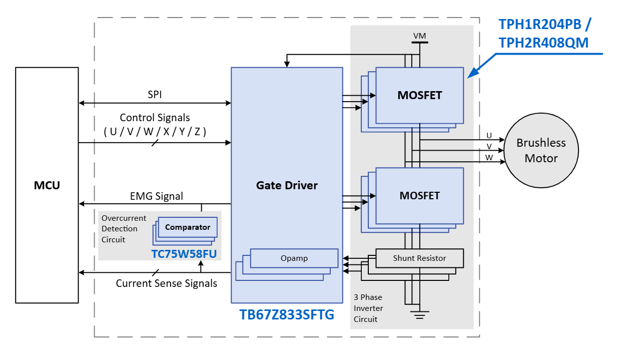 The three-phase brushless DC motor drive circuit, which combines six MOSFETs (TPH1R204PB, TPH2R408QM) and a gate driver (TB67Z833SFTG), enables compact yet highly efficient motor control. It supports various input modes. This reference design provides design guide, data, and other contents.