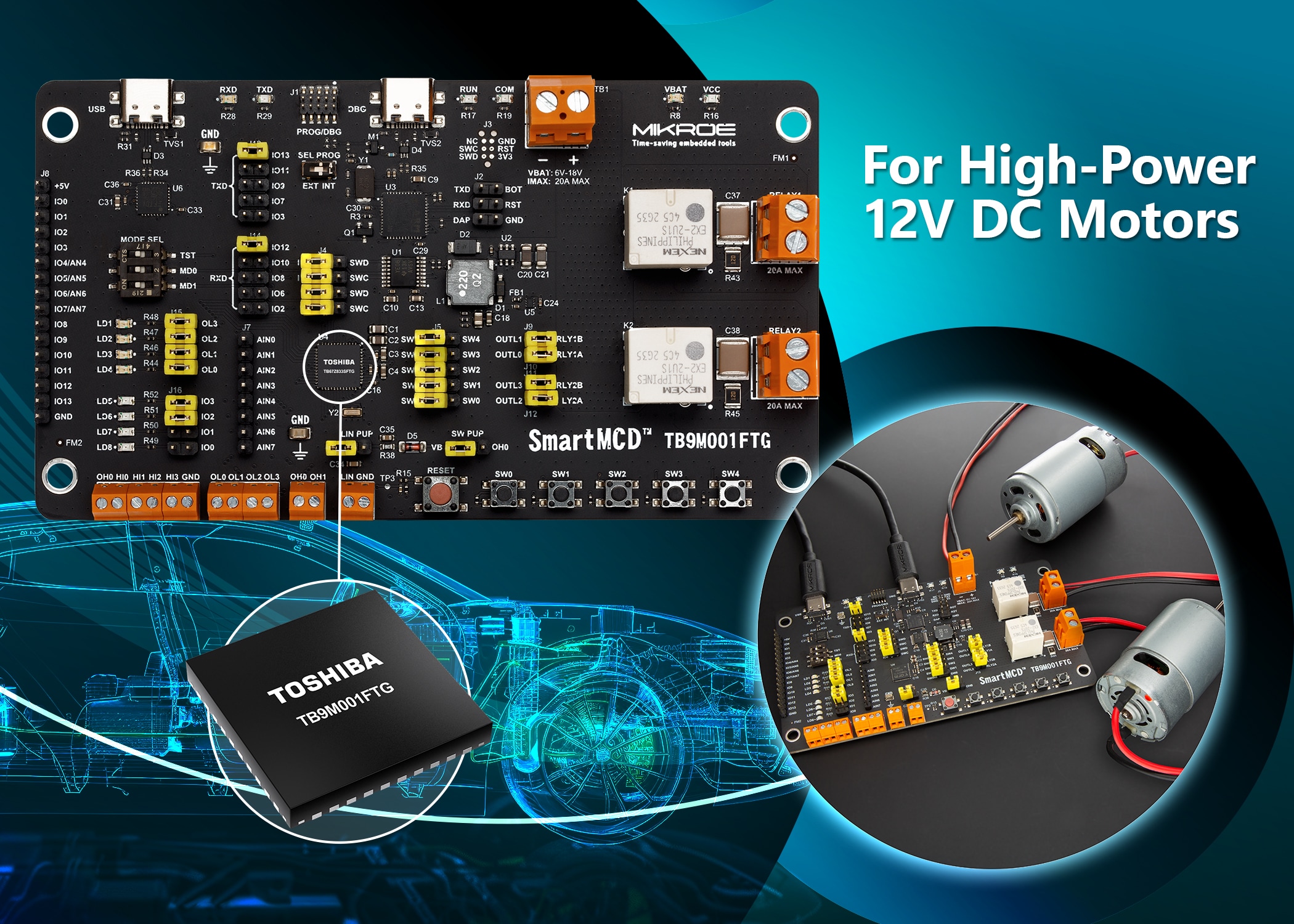 Toshiba Electronics Europe GmbH (“Toshiba”) has partnered with MIKROE to integrate its SmartMCD™ for dual brushed DC motors into the SmartMCD TB9M001FTG board. The board enables automotive system engineers to design the TB9M001FTG smart motor control driver for automotive applications, including electric sunroofs, wipers, powered windows, and adjustable seats, to streamline the prototyping phase.