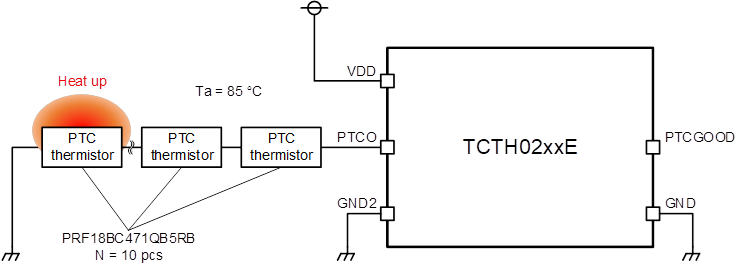For reference, Table-1 shows the simulation results of the overheat detection temperature using the TCTH02xxE and Murata Manufacturing's PTC thermistor (POSISTOR), PRF18BC471QB5RB.