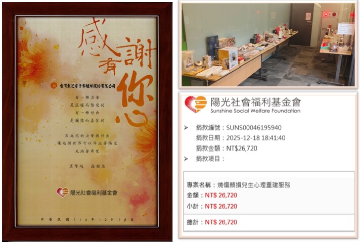 【支持陽光,守護顏損孩童】 本次活動凝聚了全公司同仁的向心力,最終募集善款 新台幣 26,720 元。這筆款項已全數捐贈予「財團法人陽光社會福利基金會」,專款用於「燒傷顏損兒生心理重建服務」。希望透過這份溫暖,陪伴這群勇敢的孩子跨越復健的艱辛,重建自信並再次綻放陽光般的燦爛笑容。