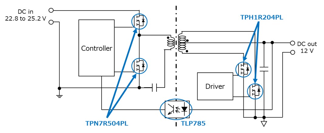 | Power MOSFET (N-ch single 30V<VDSS≤60V) | Primary-side main switch・2 | N-ch MOSFET, 40 V, 0.0075 Ω@10V, TSON Advance, U-MOSⅨ-H | |