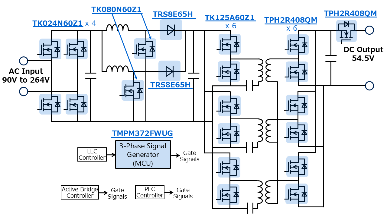 為了降低資料中心的功耗,伺服器的匯流排電壓逐漸以48 V為主流。 這是用於48 V伺服器的AC-DC轉換器參考設計。它配備了東芝最新一代功率MOSFET和SiC二極體,可在100 V至200 V AC輸入下並達到高效能輸出54.5 V DC。 此參考設計提供了電路各部分的設計要點、使用方法和調整方法的說明,以及電路圖、PCB Gerber file等對您的設計很有幫助。