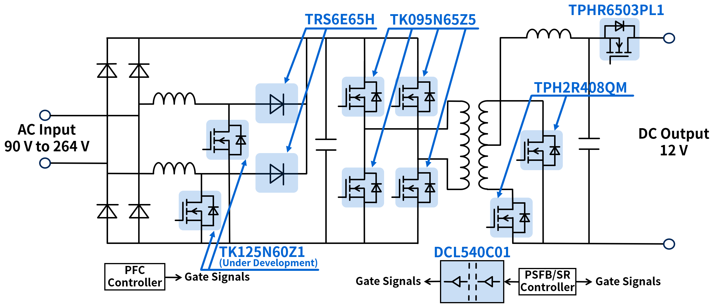 Thanks to Toshiba’s latest power devices and digital isolator, this 1U size and 12 V output 1.6 kW server power supply achieves higher efficiency at whole load than the existing reference design which uses the same circuit topology. Design files and guides for circuit design and operation are available as reference design.