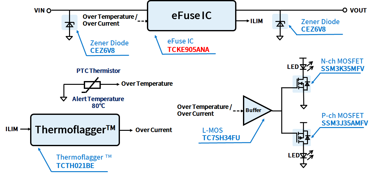 This circuit provides precise overcurrent shutdown by combining the eFuse IC and the ThermoflaggerTM used as an overcurrent detection device.